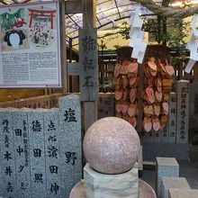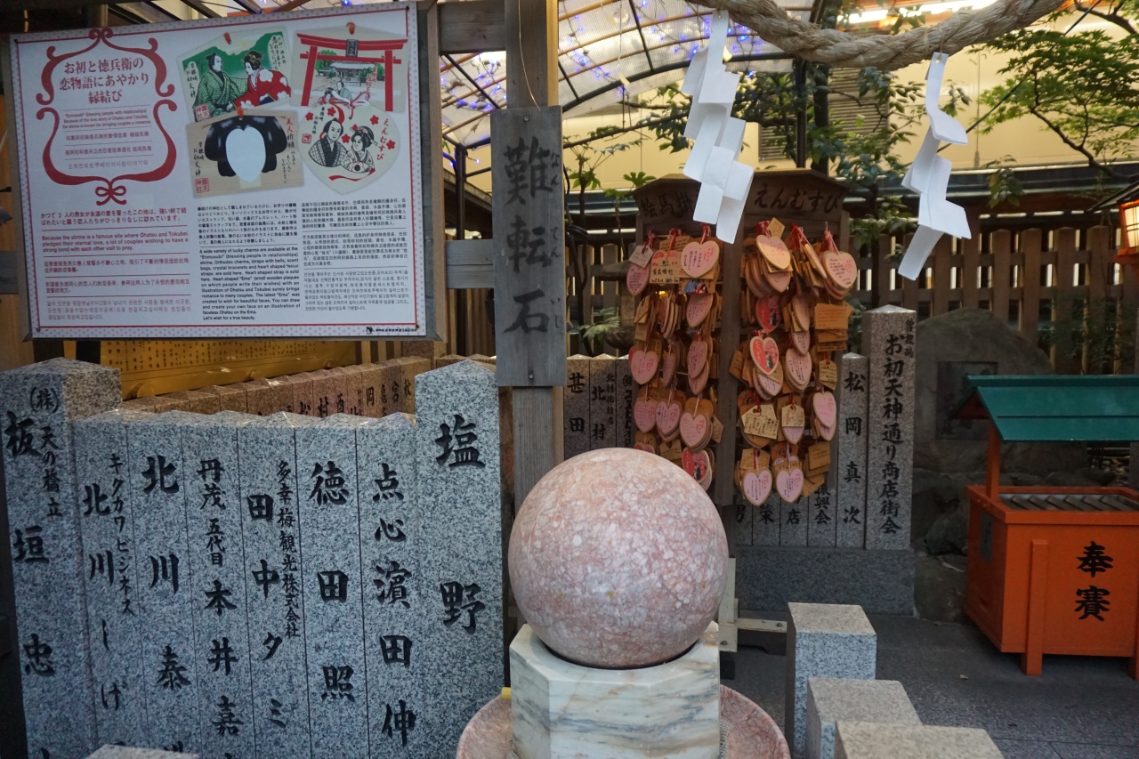 露天神社の境内。本殿に向かって左手奥のごちゃごちゃっとした辺り。お初と徳兵衛の像と同じ場所に難転石というのがあります。ちょうどボーリングの玉のような石で、湧き出る水に浮いた状態でくるくる回る仕組み。まあ、歴史はない。後になってできたものでしょう。