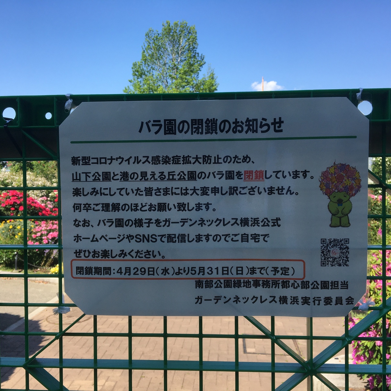 新型コロナウィルス感染拡大予防のため、山下公園の薔薇園は5月末まで閉鎖中です。垣根越しに薔薇と氷川丸が見えました。せっかく咲いた花ですが、今は楽しむわけにいきません。誰もいない花壇をハトだけが散歩していました。私たちは、来シーズンを楽しみに待つことにします。