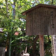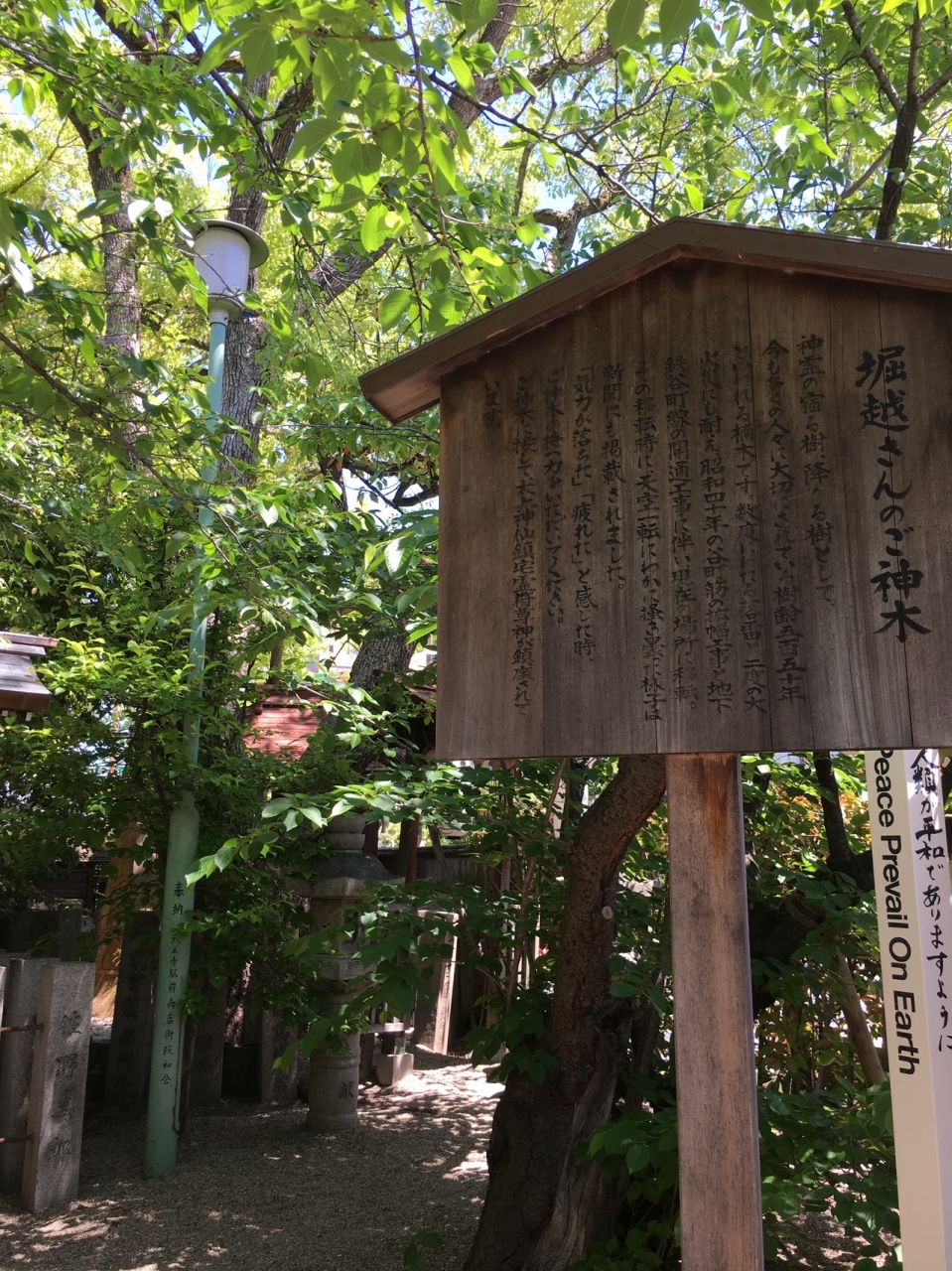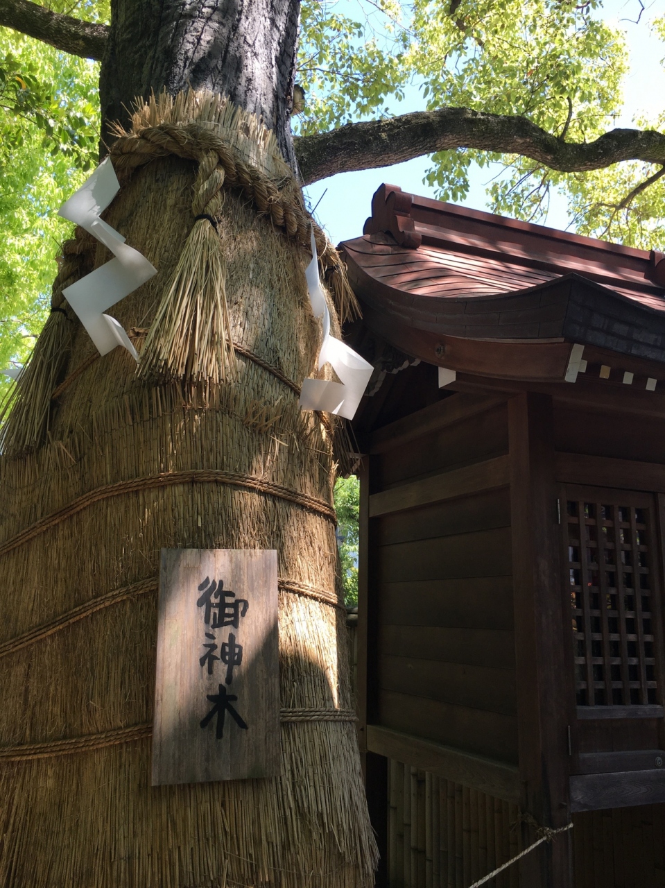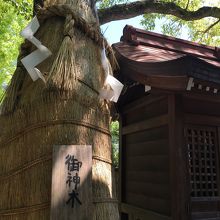 境内に木がいくつかありますが少し見つけにくい場所にありました。前後には小さな社がありほんの僅かですが狭い道を入ると御神木と書かれしめ縄が巻かれていました。上部を切ってあるので高さは高くなく枝も少ない木でした。