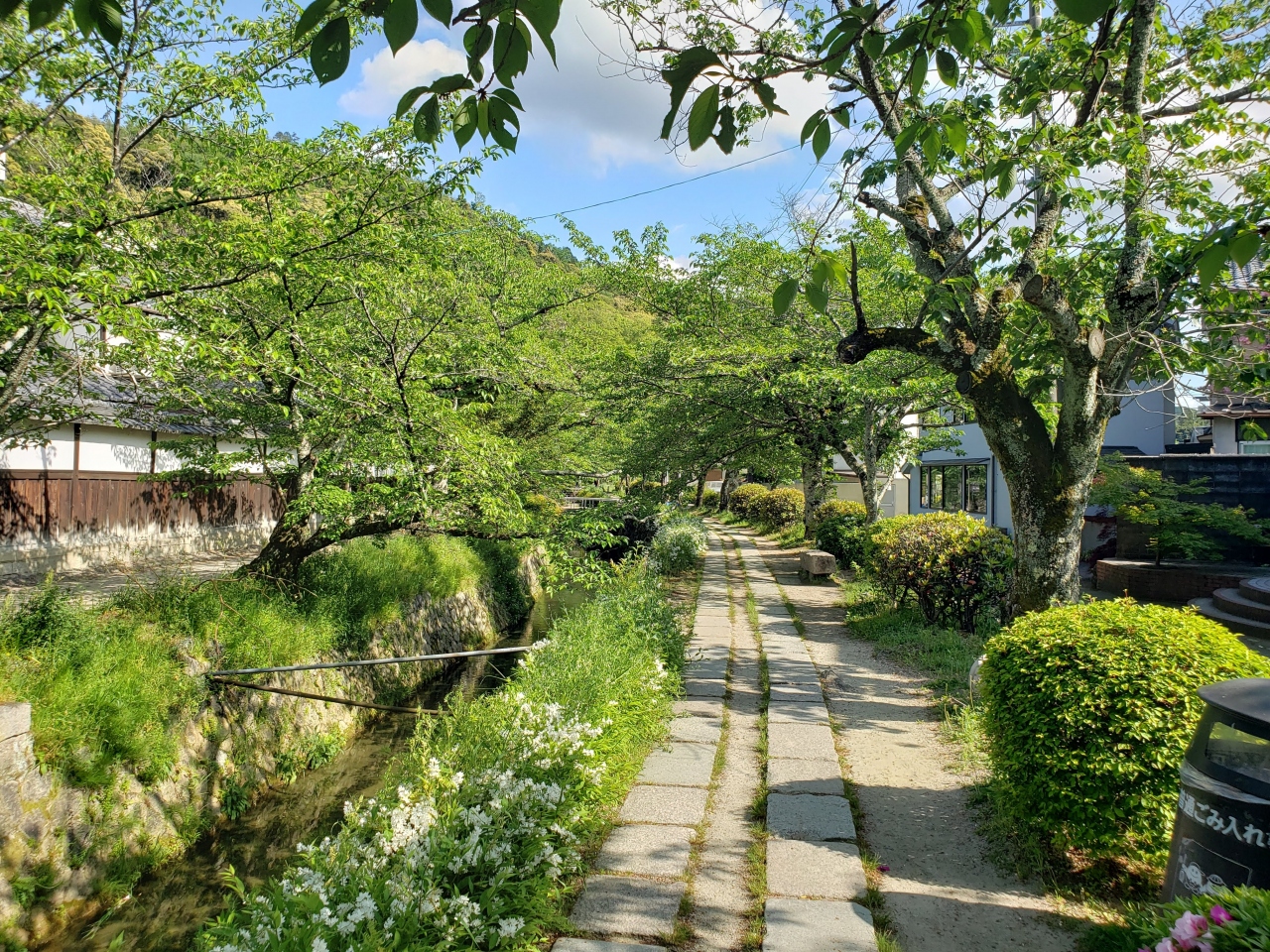 京大の哲学者である西田幾多郎が愛したことからも哲学の道と称されてきた。よく手入れされていて、確かに考え事をするときには良さそうな散歩道。小川に沿って道が作られているので涼を感じる。派手さはないけども銀閣寺と並んで通好みの場所かもしれない。