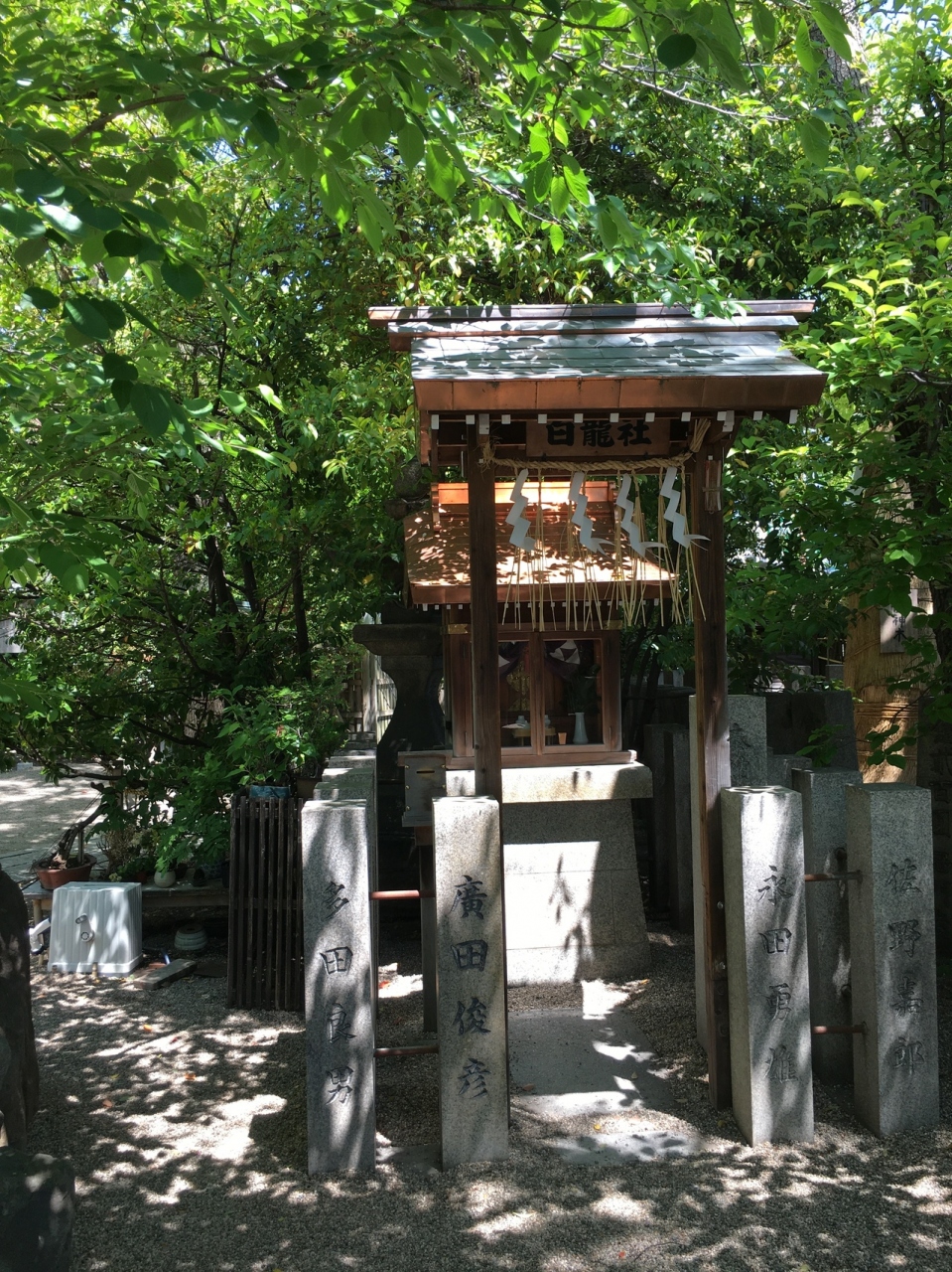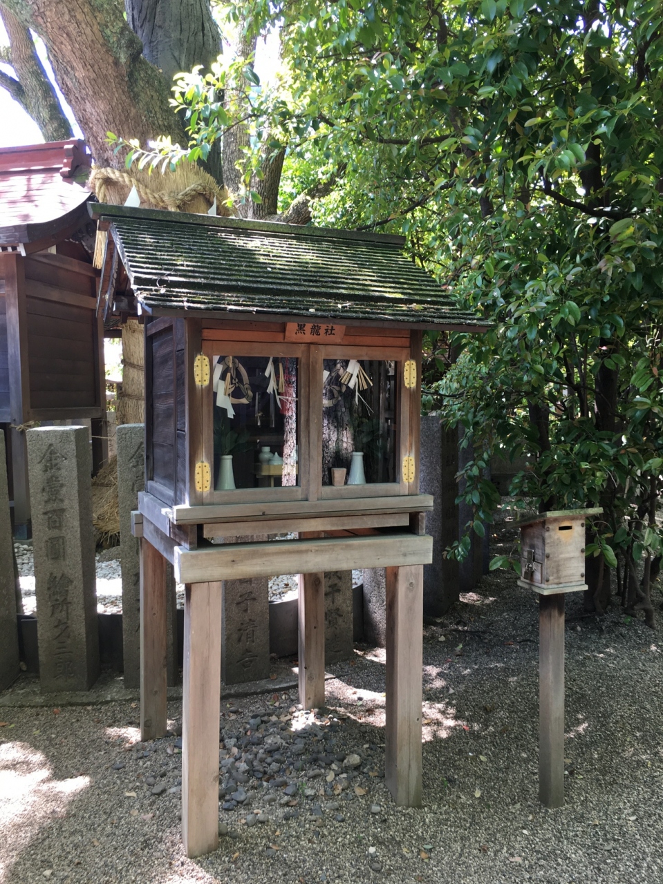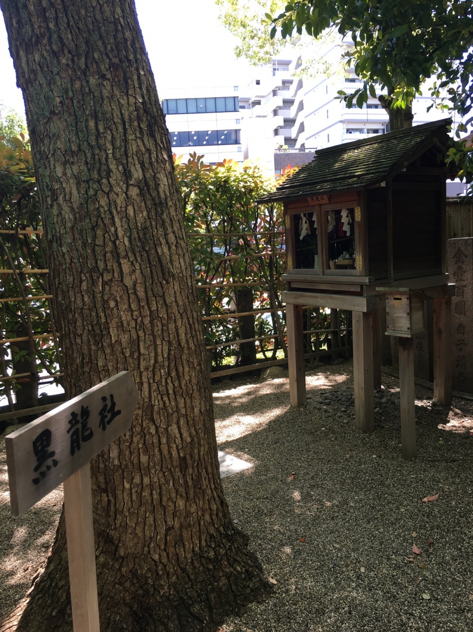 小さな祠で御神木と言う木の表と裏にあり、それぞれ並んでいるのではなく白龍社をお参りしてから、裏の黒龍社にお参りしました。黒龍社の土台は4本の木で支えられていましたが、白龍社は石の土台でした。どちらもこじんまりしていました。