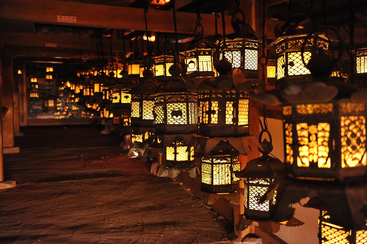 2月の節分と8月14、15日の年3回、春日大社にあるすべての燈籠に火をともす「春日万燈籠」を部屋の中の暗闇で再現する施設だ。現地の説明版によると、春日大社には平安時代から現在まで約3000基が奉納されており、国内にある室町時代以前の燈籠の6割以上がここに集中しているという。歴史的な史料としても評価が高い。中は真っ暗で、少し傾斜が。天井から違う高さに数多くの燈籠がともされており、金属に施された透かし彫りの模様や文字が幽玄な雰囲気を醸し出している。会場の「藤浪之屋」は江戸時代まで神職の詰所だった場所。春日大社の本殿内にあるため、年末年始など本殿の非公開に注意だ。