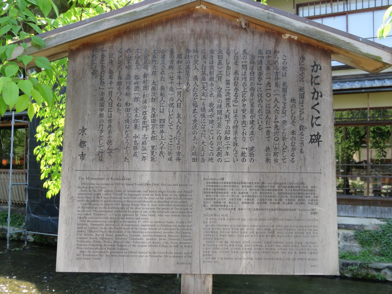 見ごたえというか、改めて京都のすごさを知りました。祇園は粋やねえ。何かにつけても祇園恋しと詠われたこの地を改めて思う。決してお世話になることはないであろう料亭や旅館にせめてこの碑で思いをはせよう。白川はさらさらと流る。