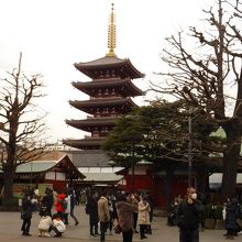 東京の浅草寺にある五重塔は、京都のお寺にあるような古風なものとは異なり、コンクリート造りで、近くから見ると、結構モダンな感じです。