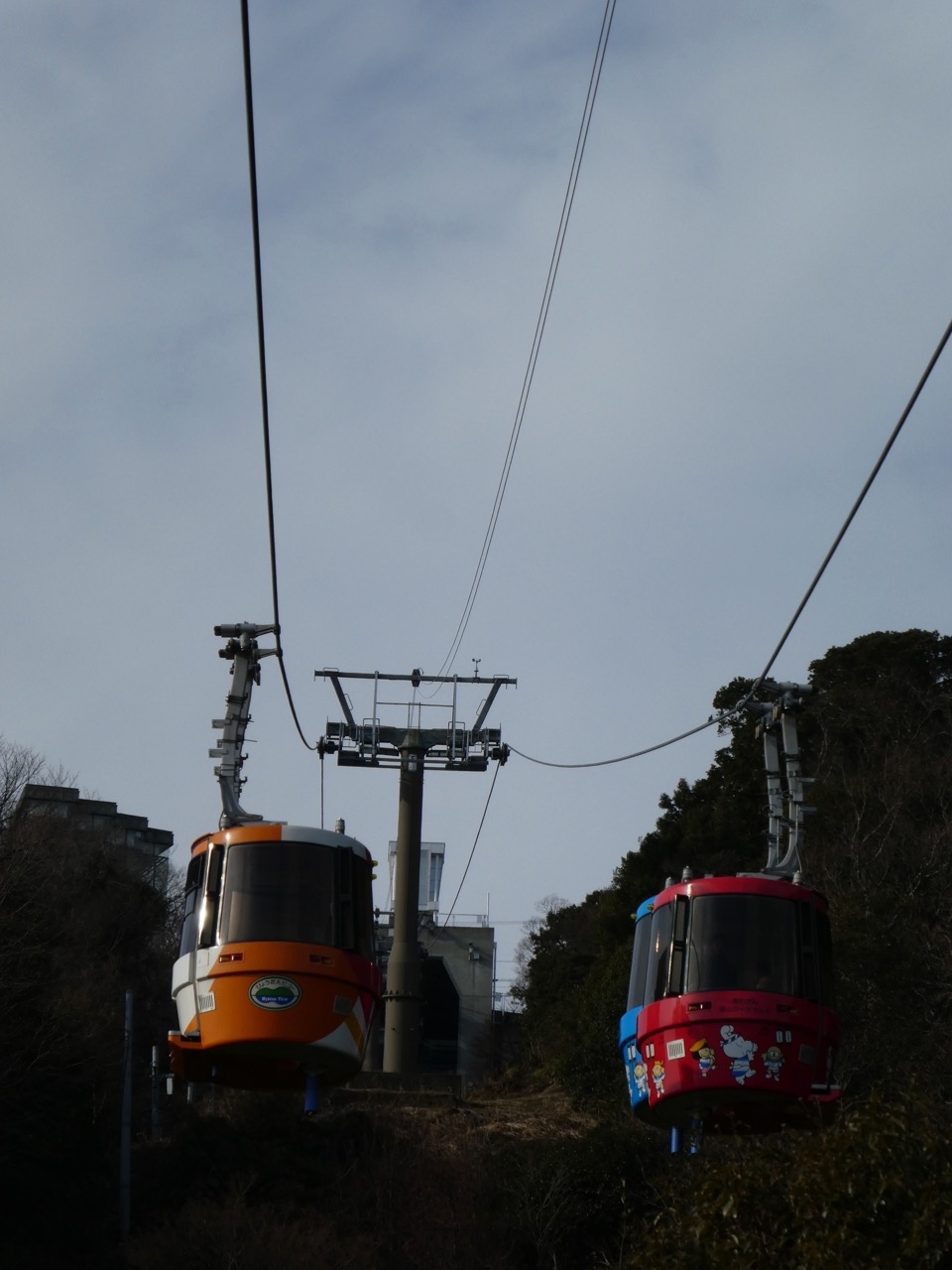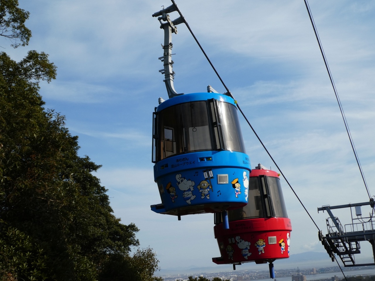 標高290mの眉山への一番楽なメインの登山手段。昔は小さなゴンドラだったように思いますが、久しぶりに訪問すると、2連の丸っこい可愛らしいゴンドラになっていました。ロープウェイで連結しているのははじめて見ました。展望席がいっぱいとれるので眺めの点ではいいですね。まあ、連結といっても本当につながっているのではなく電車的にいえば続行運転のような感じです。どうなっているのかまじまじと観察してしまいました。