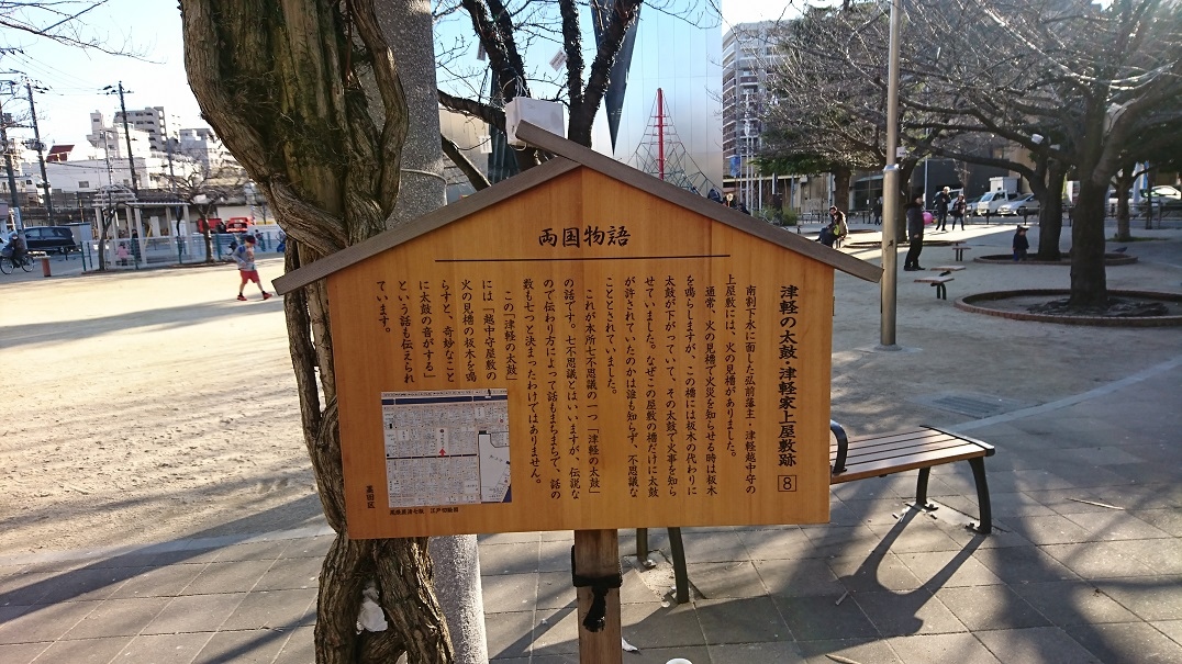 墨田区亀沢2丁目の緑町公園に津軽家上屋敷表御門跡の説明板が立っています。江戸時代に陸奥弘前藩の津軽家上屋敷のあった場所です。現在では公園になっていて緑はあるものの、上屋敷の面影は残念ながら残っていませんでした。