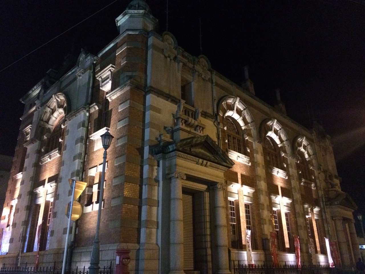 辰野金吾監修の明治時代に建てられた建物で、夜はオレンジ色にライトアップされていて、大変おしゃれでした。赤いレンガの部分と白い壁の部分があり、こだわっている設計でした。辰野金吾の銅像も立っていて、ベンチに座って写真を撮れました。