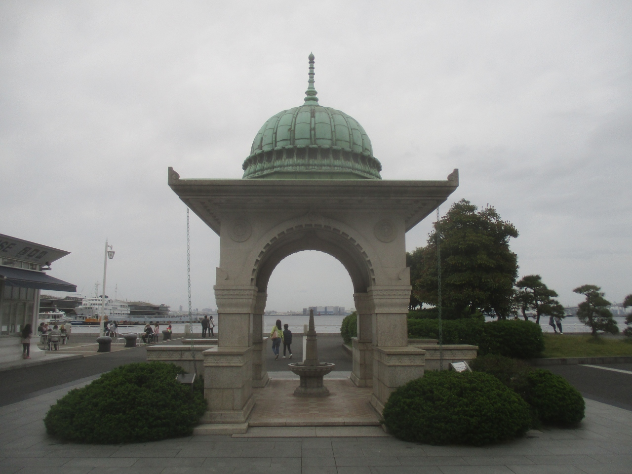 5月上旬頃にお一人でこのインド水塔に訪問しました。青いドームを見ると山下公園に再訪したことを実感し、以前にも見ていますが、塔の内部をちら見してしまいます。このドーム屋根の内側に美しいモザイク装飾が施されているこの水塔はインド式の水飲場であったことをいつも思い出させてくれます。