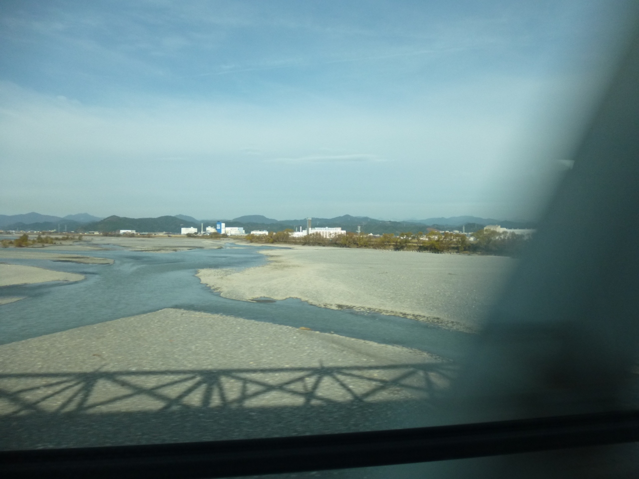 個人的には大井川というと、大井川鉄道の印象が強く、川幅が狭く激しく蛇行する上流の様子をイメージしますが、河口近くはまったく異なる光景でした。川幅が広く、水量は少ないです。ほとんどが砂州のようになっており、歩いても渡れそうな、そんな印象がありました。背後に見える山並みも美しい光景を創り出していました。