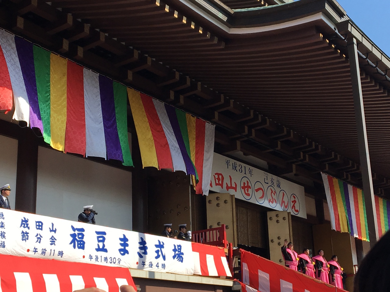 2月3日が週末だったので、友人と一緒に豆まきに参加しました。10時に駅で待ち合わせをし、新勝寺へ向かいました。参道はまだ人が少なかったのですが、本堂に到着するとすごい人でした!白鵬関や遠藤関など4人の力士の他、大河ドラマの出演者も現れ、見ごたえのある豆まきでした。