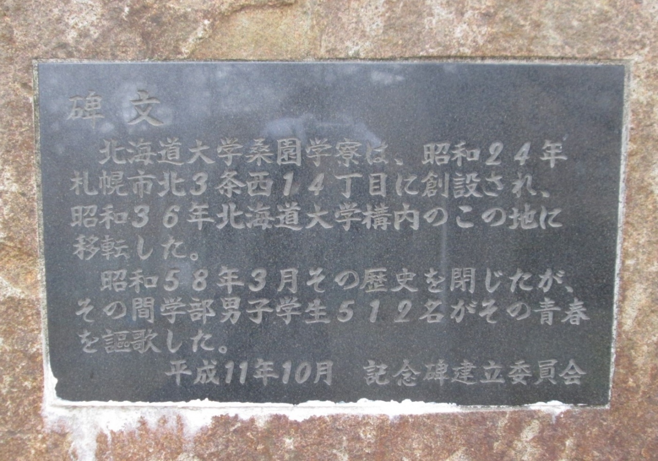 北大の構内にある学生寮跡の碑は、他に旧恵迪寮の「寄宿舎跡の碑」と「楡影寮記念碑」がありますが、いずれも目立たない所にあるものの学生の思い出が詰まった地なのでしょう。
