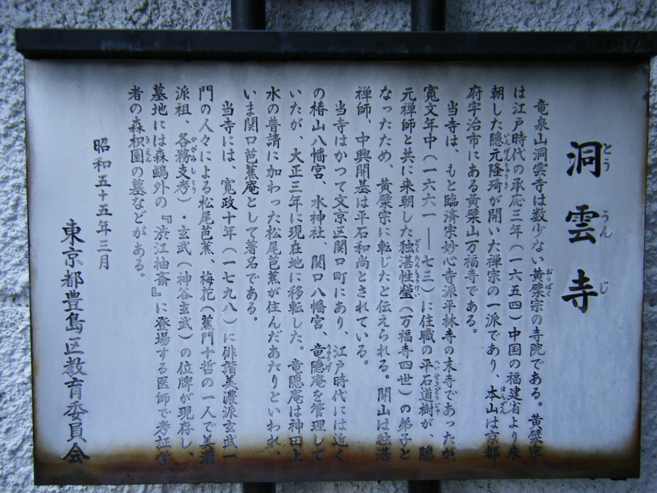 洞雲寺は池袋駅西口から徒歩15分ほど、池袋乱歩通り商店街を西にずっと歩いていくと祥雲寺という寺院がありますが、その裏手の住宅街にあります。日曜日の午前中に訪問しましたが、入口が閉ざされており参拝することはできませんでしたが、山門のそばに寺院のご由緒などが書かれた案内板が置かれていました。創建がいつなのかはっきりとは書かれていなかったのですが、当初は臨済宗であった寺でしたが、1654年に中国福建省から来た隠元隆が開いた黄檗宗に改宗したとのことです。黄檗とは京都の黄檗の事でしょうかね。初めて聞いた宗派なので興味深かったです。また境内には松尾芭蕉の位牌なども現存しているとのことです。見たかったので残念です。中を見ることは出来ませんでしたが、趣のある山門が見れたので良かったです。
