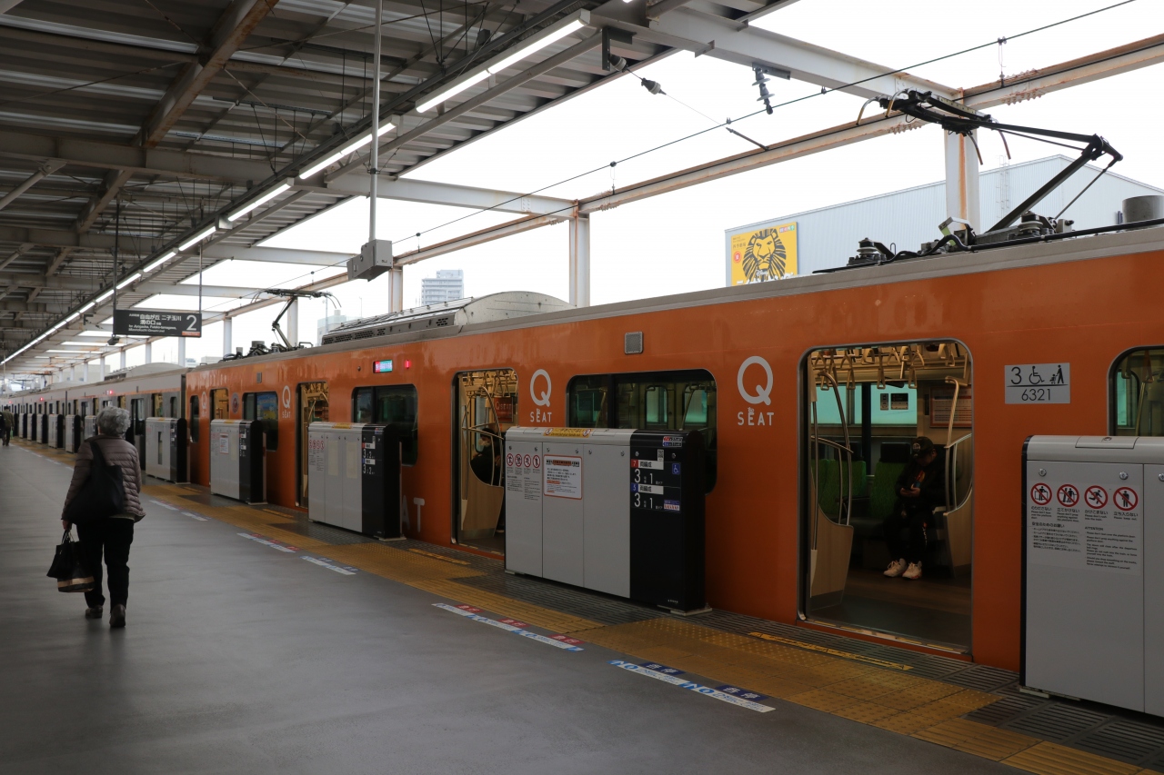 平日夜の一部急行列車に設定されている座席定員制のQシート。車両の外観塗装がそこだけオレンジ色になっていてよく目立っていますが、当該時間帯以外は普通に座れます。急行と各停で車両も異なり、急行用の方が座り心地が良く乗っていて快適です。