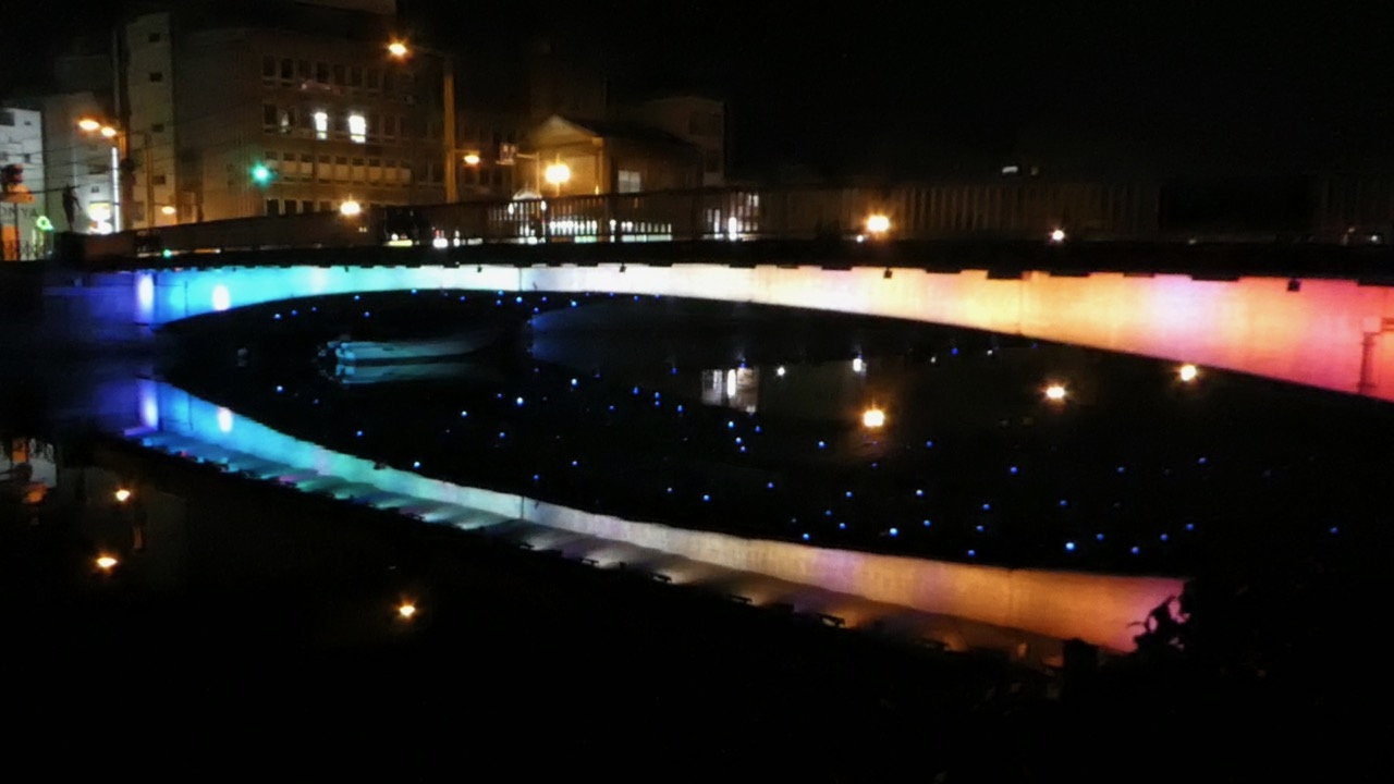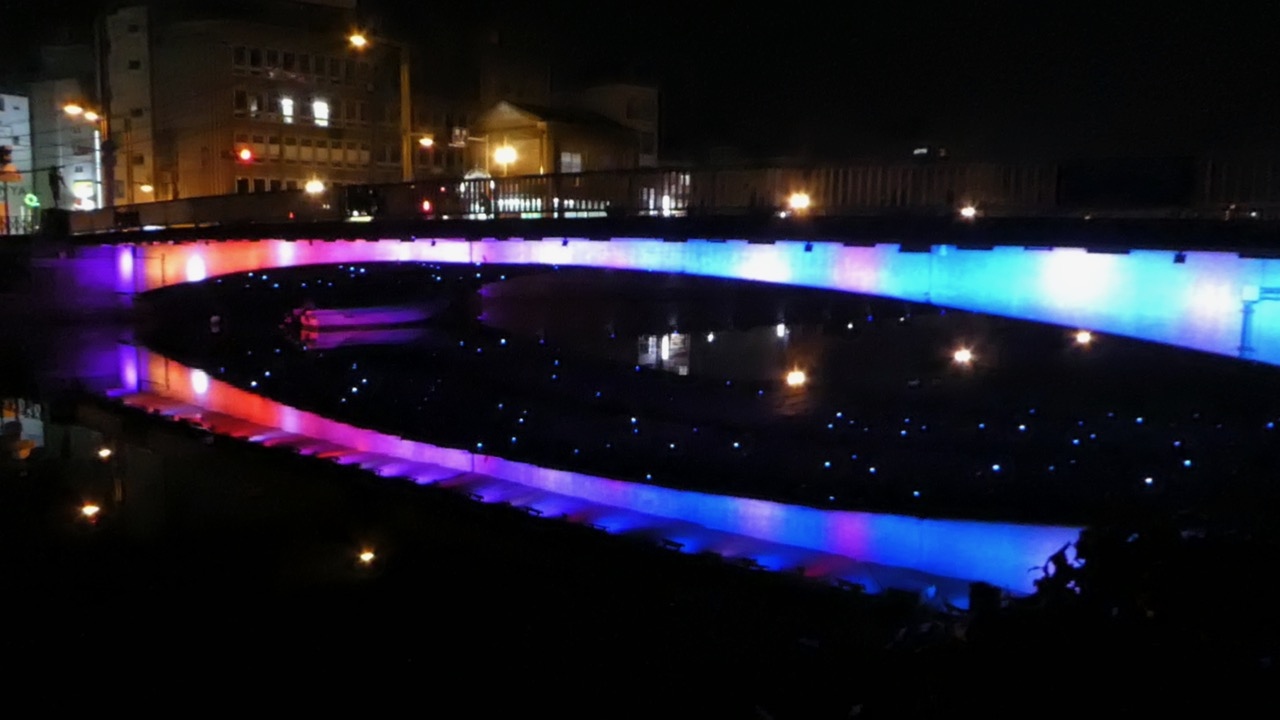 夜のライトアップを見に行きました。徳島は青色LEDの企業のある県なので、ライトアップに熱心で、この両国橋はその中でも一番見事でした。夜22時までなのですが、その終わりころになると次々と色を変え、おまけにレインボーカラーになったり左右に激しく動いたり見ていて飽きません。川が鏡のようにきれいなので2倍の大きさに見えます。それに橋の下面にも星のようにLEDがあって川面にきれいに光が映ってます。訪問時は22:06までは点いていました。