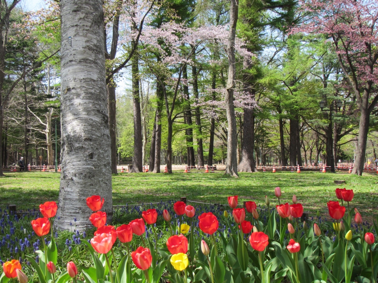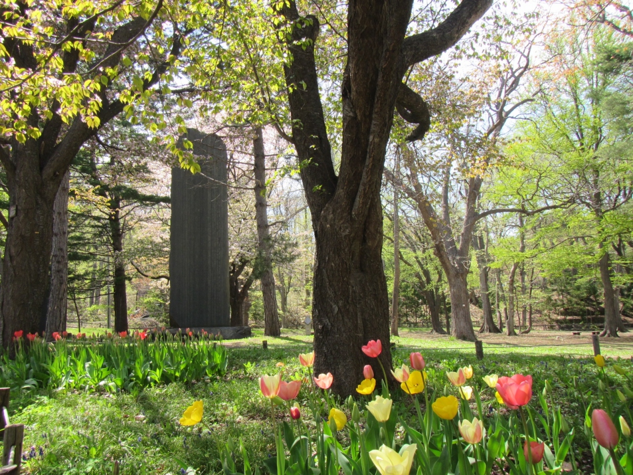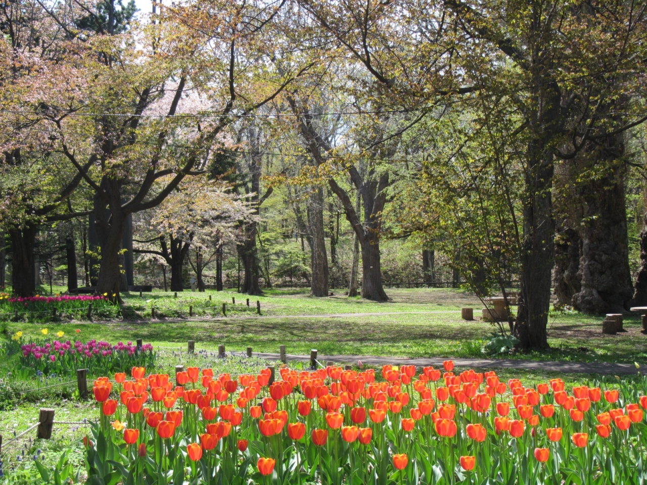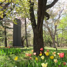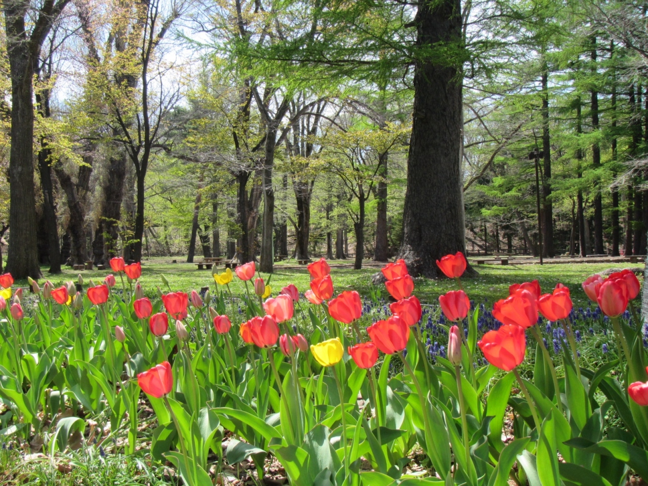 付近の樹林下の園路沿いにはチューリップが植えられていて、その年の気候にもよりますが、おおよそ5月10日前後にきれいに咲き誇ります。