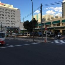 タクシーなどのロータリーの向こう側、大通りの手前の小さなスペースにある意思でできた碑です。