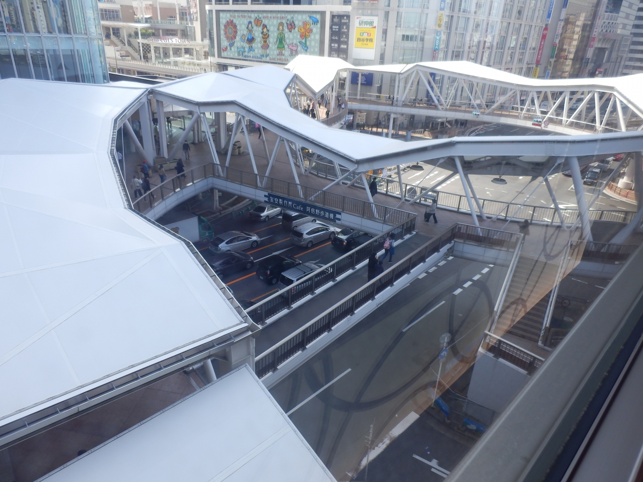 この橋完成は2015/4なので投稿としては新鮮味はないがこの橋の上から見ると橋の歩道部がアルファベット小文字のaに造られている、意識して造ったのではなく誰かがaの文字を描いているといったことからなるほどと言われるようになった、上から見るのは通常では困難だがすぐ横の天王寺MIO南端からそれらしい状態が眺められました