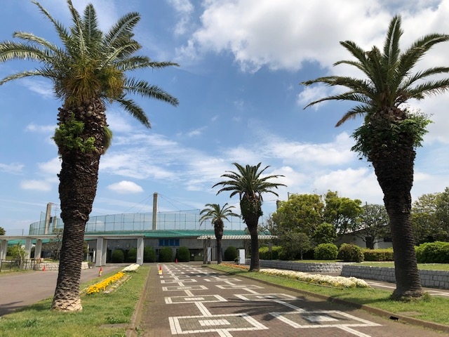 引地川沿いにある公園で、スタンドもある大きな野球場を中心に、たくさんのテニスコート、そしてプールとそろっています。芝生の広場では、自由に遊べるようになっています。公園の正面入り口を入ると、大きなフェニックスの木が道の両側に3本ずつ立っていて、南国の雰囲気を醸し出しています。