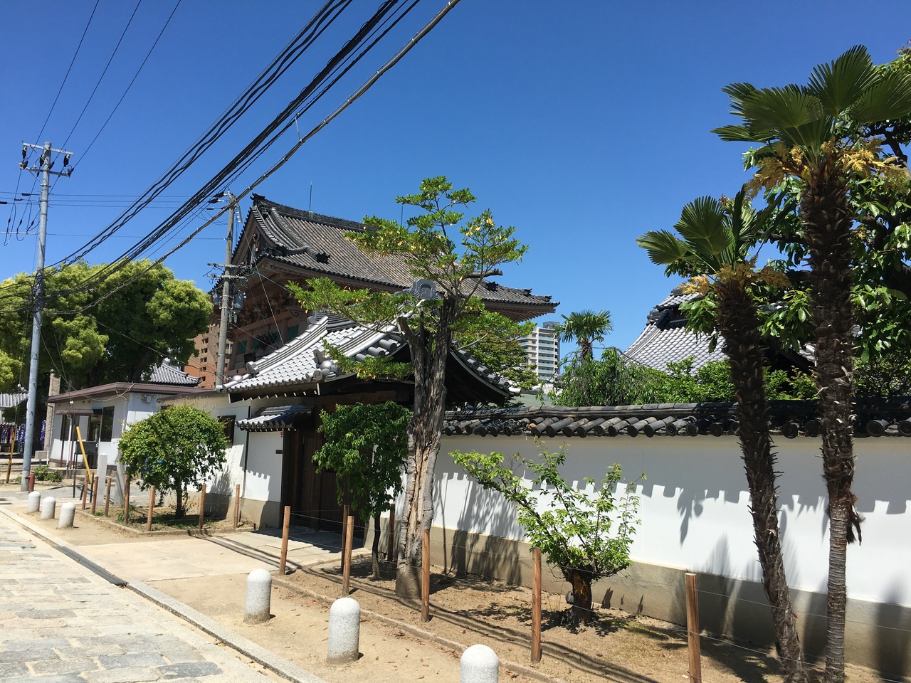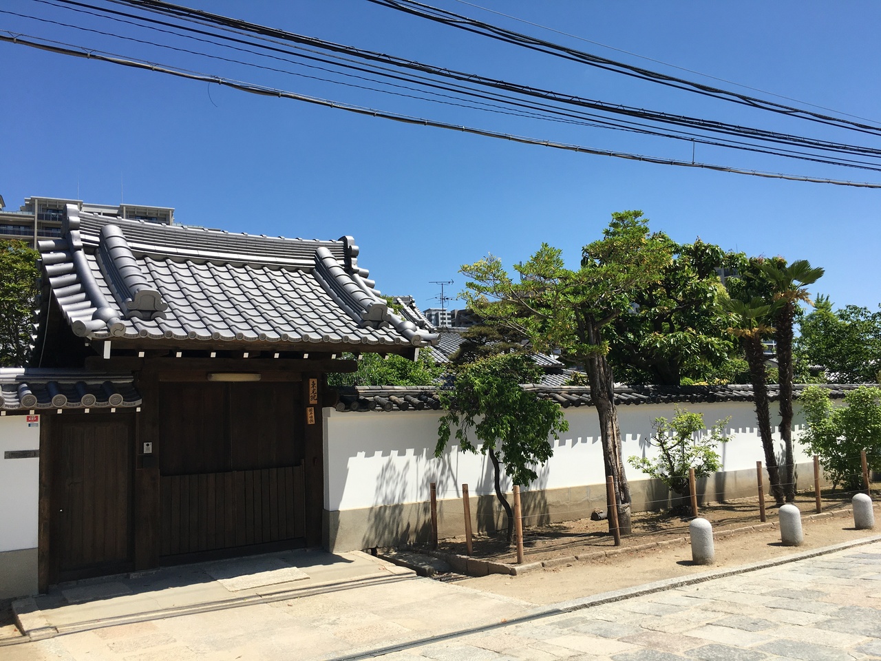 四天王寺の境内にあり、六時堂の裏手にありました。白い壁が長く城壁のようにも見え、壁の上は瓦屋根でした。壁の前に木が植わり、南国の高い木も植わっていました。正面からより斜めから見ると景観が良いです。門が閉まっていたので中に入れず残念でした。