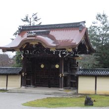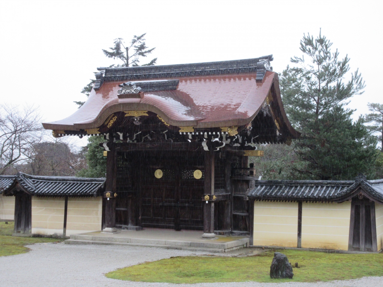 大覚寺にある、菊の紋が施された印象的な門が勅使門です。天皇陛下が行幸の時や陛下のお使いが来られる時しか開門されないので、我々は近くでも見ることはできないのです。この門は江戸時代の建築です。御影堂から庭園越しに見ることになります。