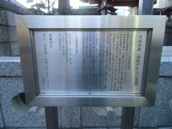 手に持つわらじに願いを託して、自宅まで届けてくれる地蔵菩薩で、「手わらじ地蔵」と呼ばれています。