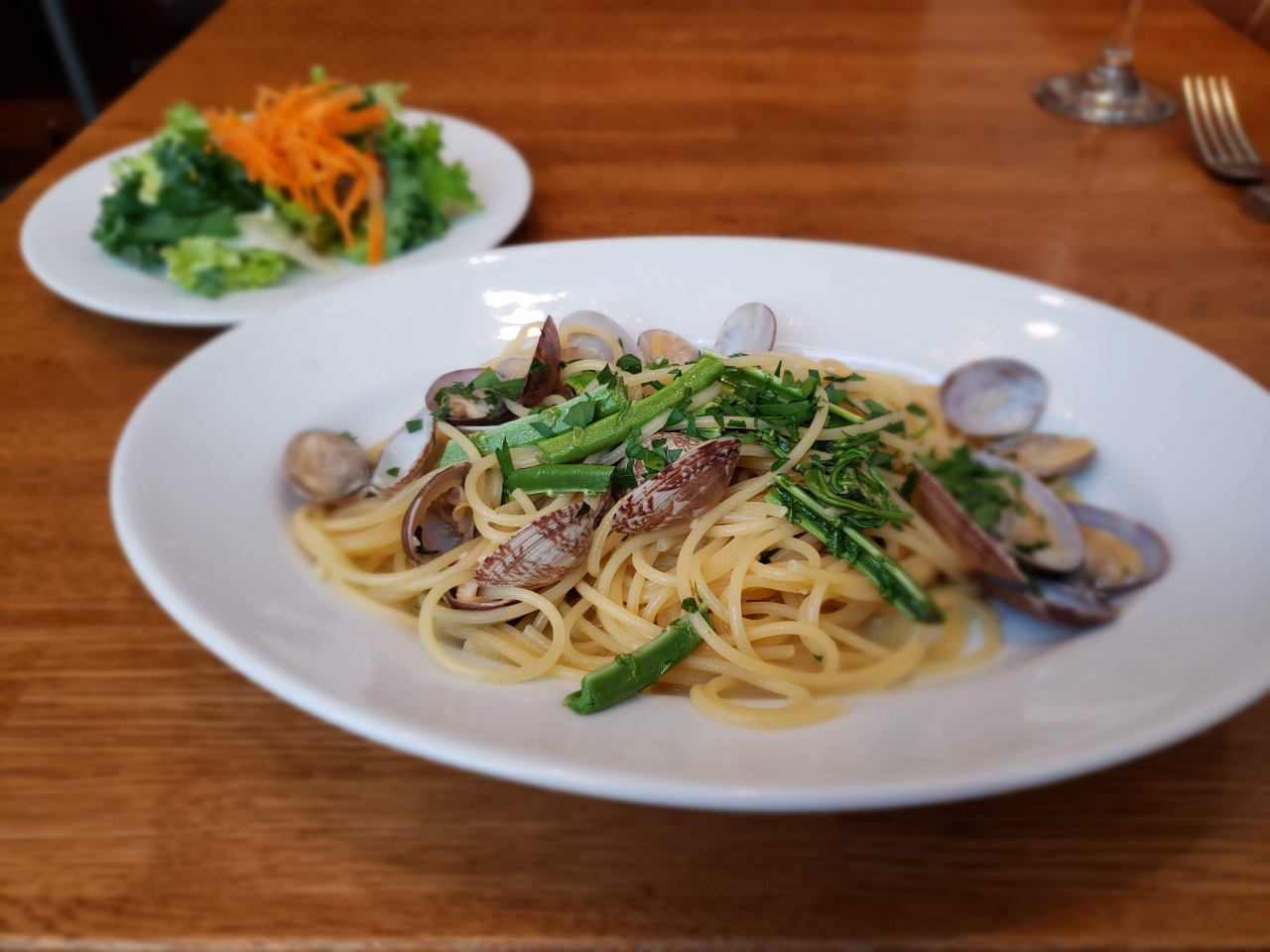 銀座の裏街道にあるこじんまりとしたイタリアン。夜は結構高い感じがしたらランチ時だと1100円~とそこそこリーズナブル。ピッツァかパスタで選べます。アサリのスパゲッティを頼んだが、上に載っているバジルが効いていて旨かった。
