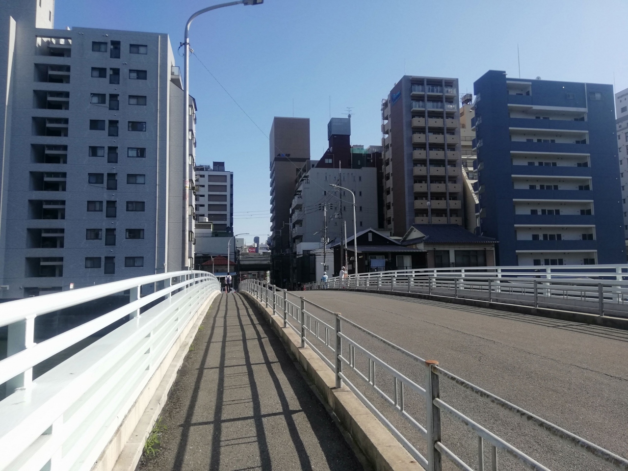 道頓堀川に架かる橋の一つです。周辺には、マンションやお洒落なお店が並ぶ「オレンジストリート」があります。元々は、元禄11年(1698年)に架けられた橋で、今から300年以上も前に、この辺りに土佐藩士や薩摩藩士が闊歩していたのかと思うと不思議な気持ちになります。橋の北東側のマンション(道頓堀プラザ)の外壁が、レトロなタイル張りで素敵でした♪