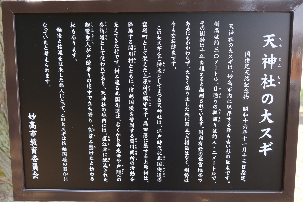 旧関川宿から北国街道を1km程北上したところにある関川公民館の対面に天神社があります。この神社の御神木である大杉は国の天然記念物にも指定される程の大杉です。何と樹齢は1000年とも言われ、下から見上げると首が痛くなる程。また写真に撮ろうとしても中々良い写真が撮れず、全景を撮るには離れた所からしか撮れません。