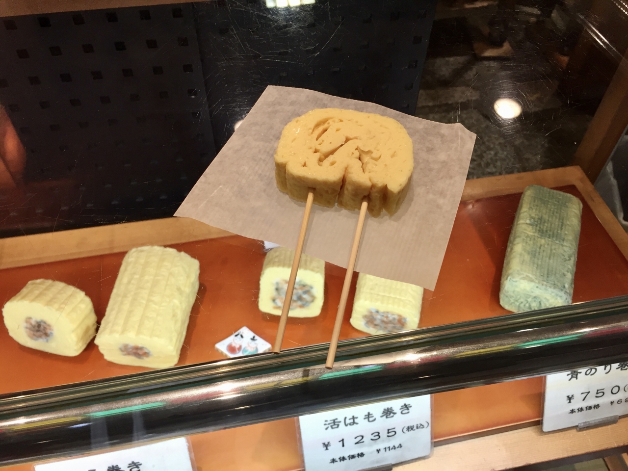 串に刺さった一口サイズの出汁巻きをいただきました。さすがに食べ歩いている人はいない時期だったので店頭でいただきました。奇をてらわない基本に忠実な出汁巻きでした。薄味でフワッフワ。これぞ出汁巻き!お出汁の味が分かる人にしか分からない美味しさです。