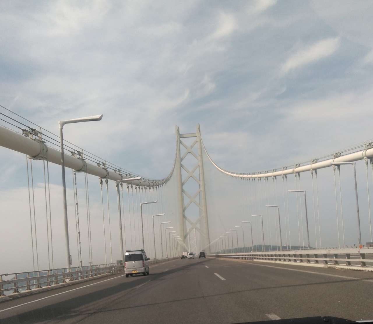 世界一の釣り橋である、この橋も淡路サービスエリアの展望台からの眺めも、天気の良い日にはくっきりと海と空の青さのなかに浮かぶ光景は何とも言えない壮大さを感じる。作った当時の有料道路料金も、今では淡路の観光誘致のため料金も半額以下になってるので通行しやすいのも魅力である。