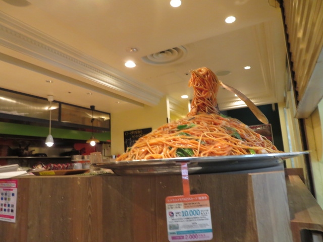 焼きスパゲッティのレストランです。カウンターのお店なので一人で入りやすいお店です。焼きスパゲッティということで、香ばしさがあります。個人的には、麺がもう少し細い方が美味しいかなと思いました。入口の巨大スパゲッティのオブジェは見ものです。