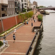 隅田川の河岸にずっと伸びているテラスで、お散歩などに利用できるようになっています。