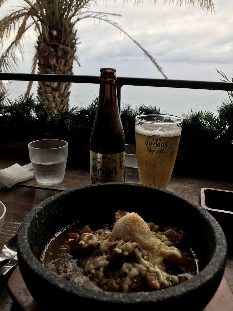 北谷の海を眺めながら、熱々の焼きカレーとビールを飲める最高のロケーションです。鉄のフライパンで焼かれたカレーはラー油がアクセントになり少しピリ辛。そこにチーズが加わり、まろやかさを演出してくれます。景色を楽しむテラス席とクーラーが効いた涼しい店内、どちらでの食事もオススメです