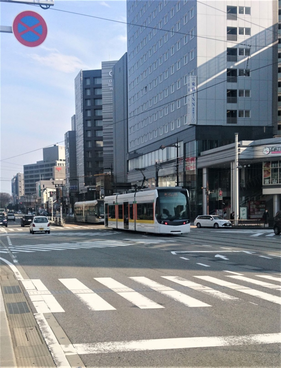 北陸の富山市の市内中心部を走る路面電車。富山市はモータリゼーションが進み、ショッピングゾーンが郊外の主要道路沿いに拡散しているが、公的な主要施設は市内中心部に残っていて、そうした場所へのアクセスにはこの電車が便利。