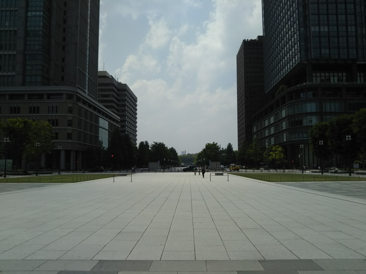 東京駅赤レンガ駅舎と大名小路との間に広がる歩行者専用スペース。行幸通りから皇居まで一直線に見渡すことができ、駅前広場としては日本離れした風景です。