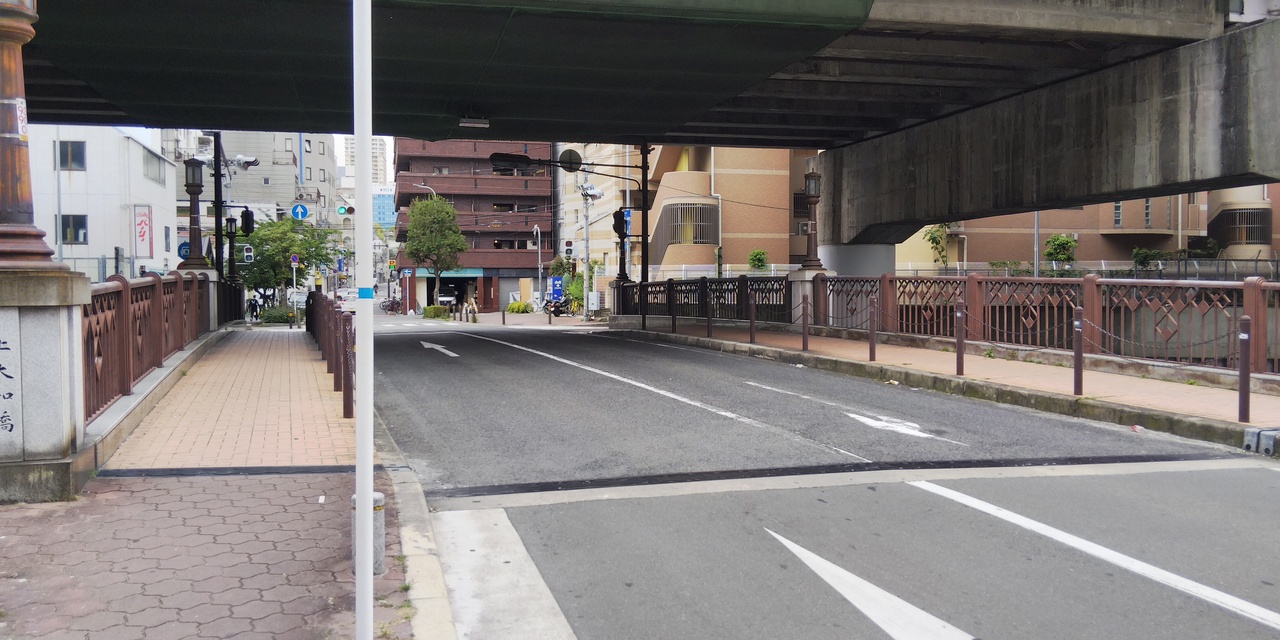 上大和橋は、大阪市内の流れる川・東横堀川の一番南側にかかる橋です。川はこの橋を過ぎて、西側に折れると道頓堀川になります。橋の上には阪神高速がはしっています。最寄り駅は、日本橋駅か谷町九丁目駅が近いですね。