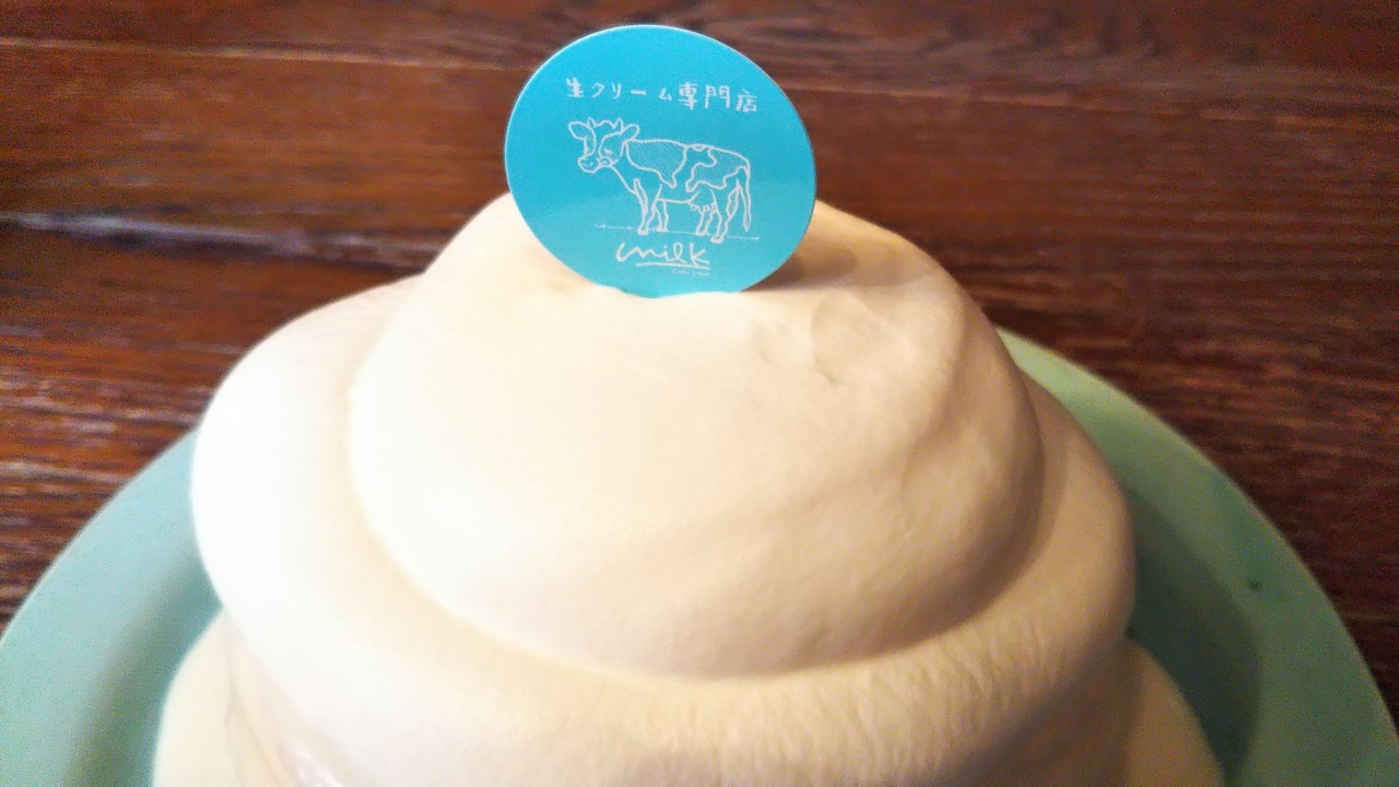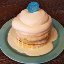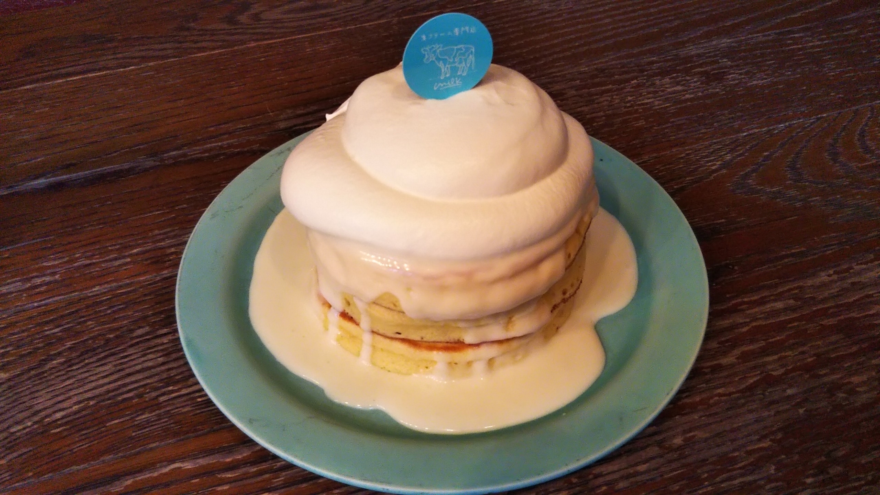 ふわふわ生クリームがのったパンケーキ「究極の生クリームミルクパンケーキ」がシンプルでおいしい☆中のパンケーキはいたって普通のパンケーキで、スフレタイプではない。上の生クリームや、パンケーキにかかっているミルクソースがおいしい☆