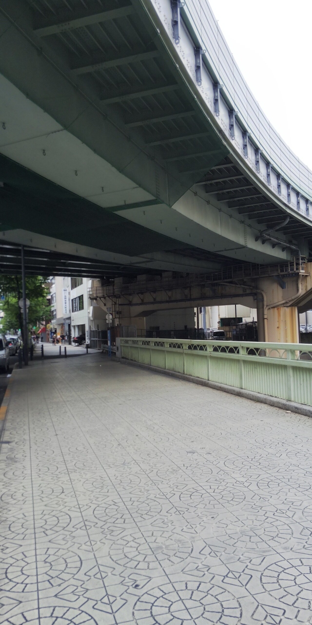 大阪市内を流れる東横堀川の中央大通にかかる橋です。真上に阪神高速のジャンクションがあり、ごちゃごちゃしていて、なかなかおもしろい風景になっています。橋自体は中央大通にある橋だけに車線も多く、歩道も広いので、通行しやすいです。