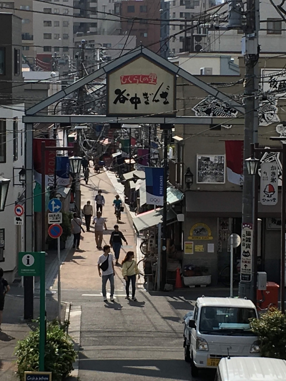 全長170mの通りに60店舗ほどの商店が軒を連ねる下町商店街です。「下町東京レトロ」と形容されるとおり、昭和の香り漂う雰囲気が人気で週末にもなると沢山の観光客で賑わっています。生鮮食品、昔ながらの手づくり惣菜、お茶や和菓子など、地域の人々の生活に密着した個人商店と、手頃で美味しい下町B級グルメを食べ歩きしたり、下町情緒を刺激する土産屋を覗いたりと、観光客も楽しめる商店街となっています。代表的なフォトスポットは日暮里駅から谷中銀座に下る36段の階段上からのショットです。夕焼けスポットにもなっていて「「夕やけだんだん」というニックネームを持つ坂です。TV番組のロケ地として取り上げられることが多い場所で、黄昏時に広がるノスタルジックな風景は、「三丁目の夕日」的な世界観です。