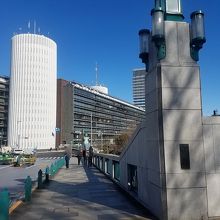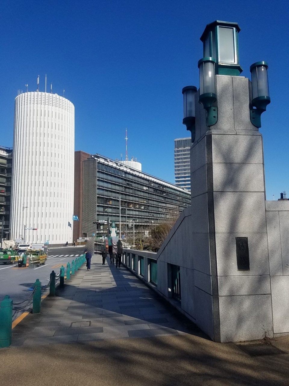 代官町通りが清水濠を渡る所の橋です。最初は竹で編んだ橋だったからこう呼ばれますが現在の橋は1926年に架けられたコンクリート製のものであまり風情はなく、どちらかというと周囲の高速道路やパレスサイドビルの印象的な円筒形のエレベーター塔などと調和しているかんじです。近くにお濠のほとりまで下りられるスペースがあるので皇居の石垣を眺めながら休憩すると良いと思います。
