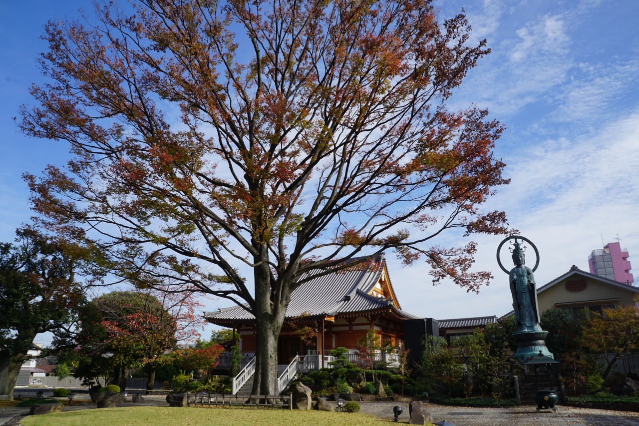 正光寺は、山門を入ると広い境内。参道正面に現れる岩淵大観音も三丈三尺というのですが、見上げるような高さの立派なもの。本堂に観音堂、真ん中に大きな木が辺りを圧倒するように立っていて、この景色を見るだけでも価値があるように思います。