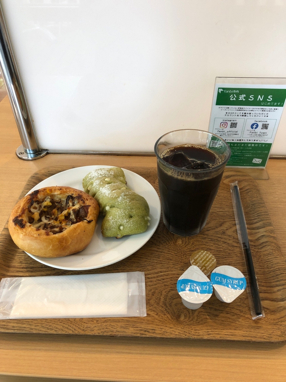 卸売デパート・ファンビタウン1号館1Fのカフェです。クロワッサンという名前ですが、クロワッサン以外のパン・サンドイッチなどもあります。コーヒーは250円ですが、ファンビ寺内のカードを持っていると150円になります。2F席、テラス席もあるのでゆっくりできます。