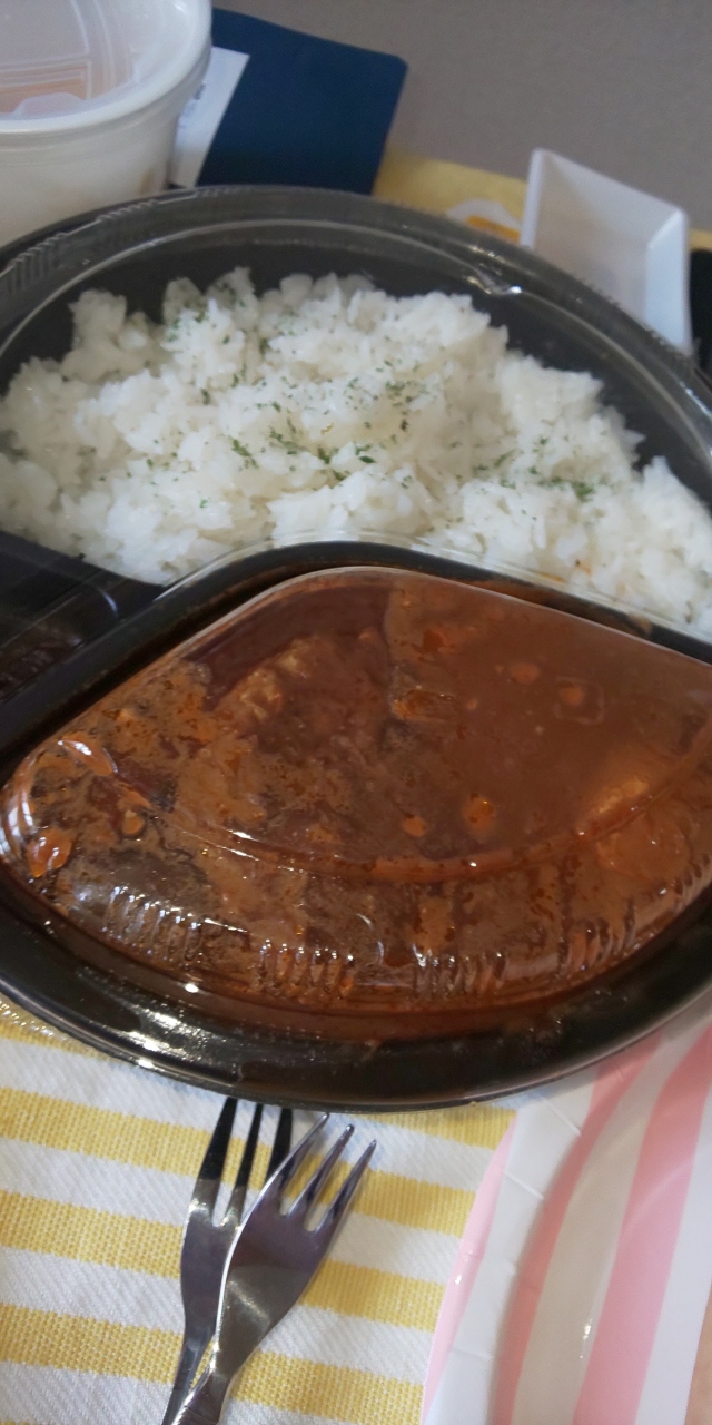 お弁当を購入、今日はハンバーグシチューでした。優しいお味のハンバーグで、茄子、卵などが入っていました。1500円。
