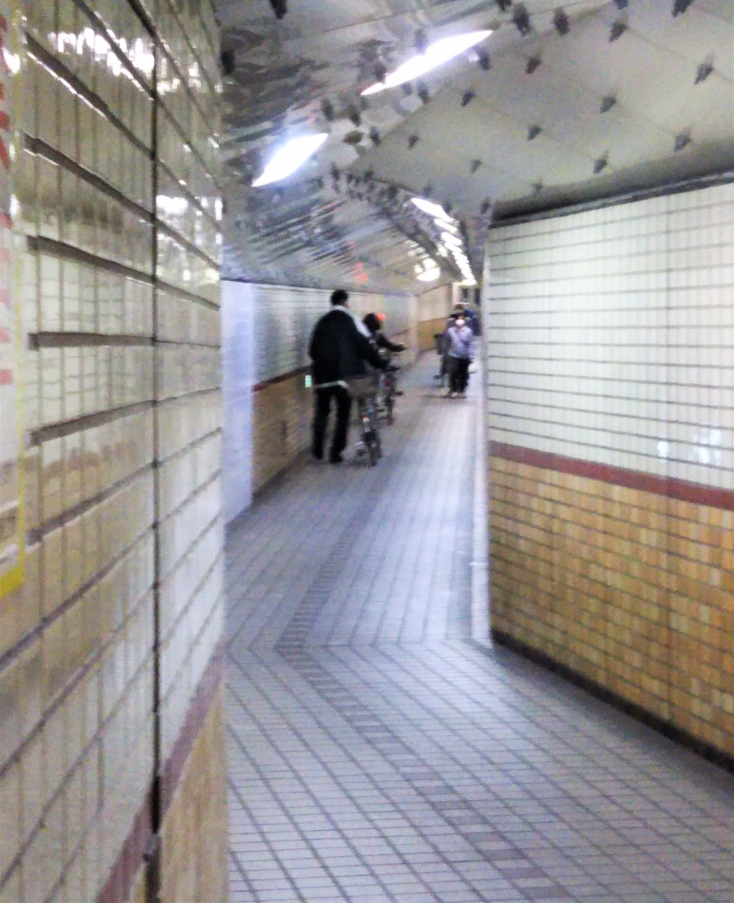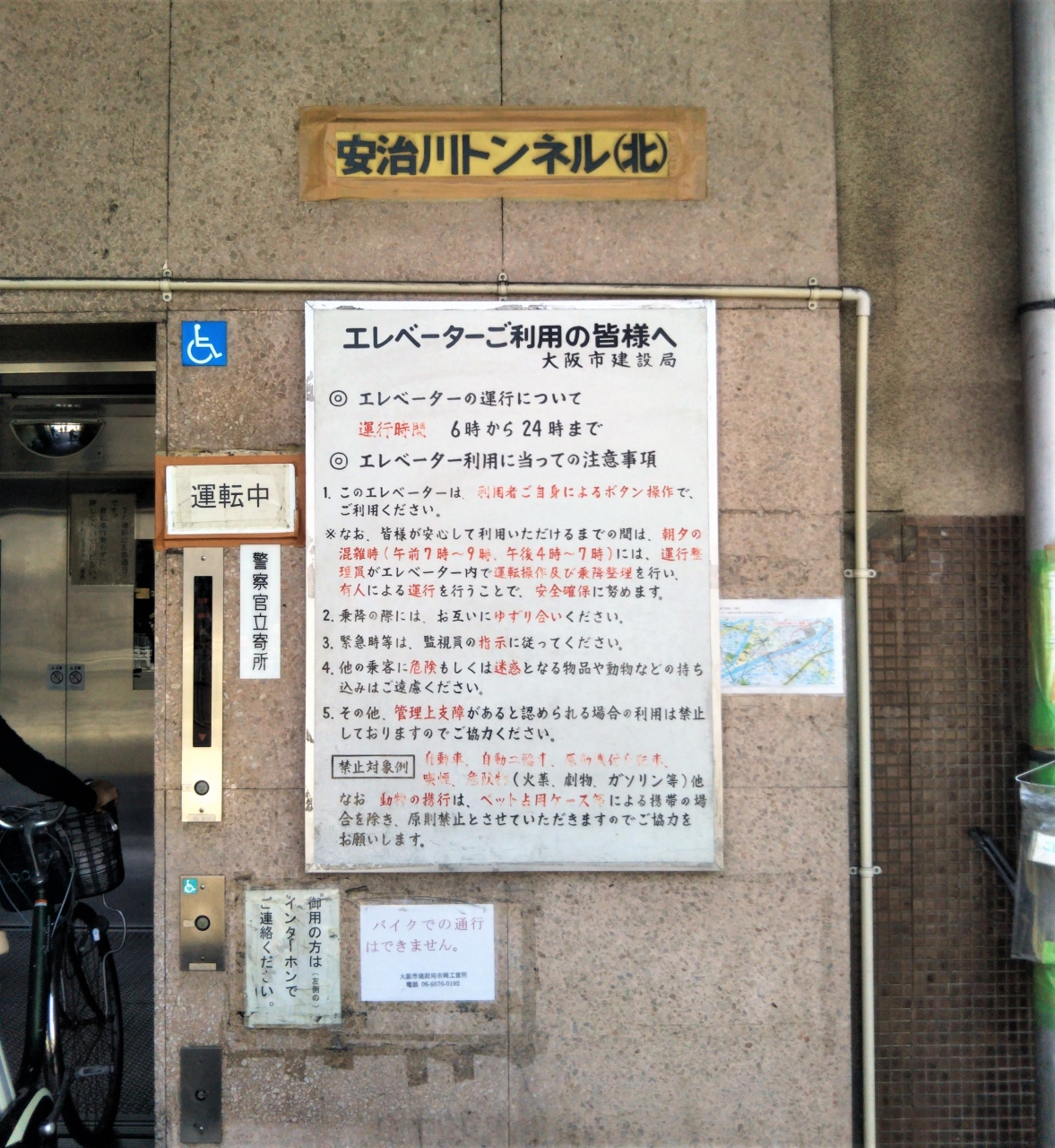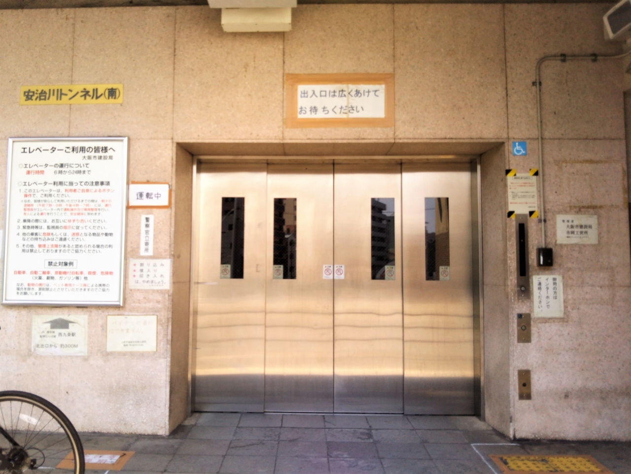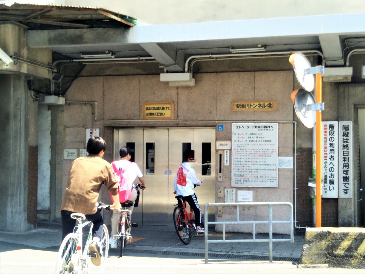 九条駅と西九条駅の間で安治川を越えられるトンネルです。西九条駅からだと南に200mほど行くと安治川トンネルの北側に着きます。トンネルにおりる為のエレベーターが設置されていて、自転車もokです。ただトンネル内の自転車通行は押していくルールになっていて、もし乗っている人がいると、即座に注意アナウンスがありますので注意しましょう。
