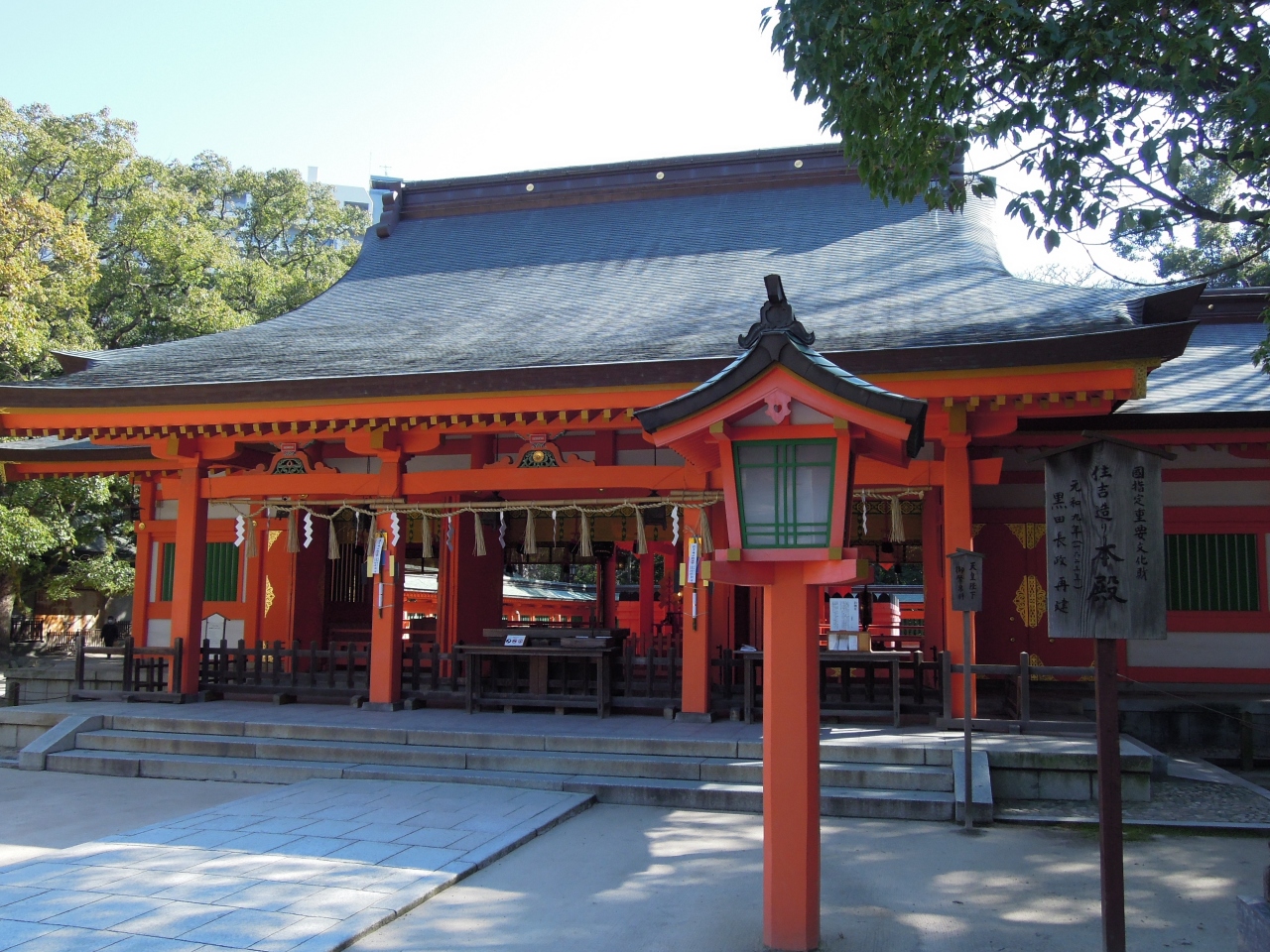 JR博多駅から近い街中の神社だ。大阪の住吉大社、下関の住吉神社と並んで三大住吉と呼ばれる。現地には、全国に住吉という名の神社は2000以上あるが、ここが始祖だとする記述があった。黒田長政が建立した社殿で、本殿は住吉造の典型として国の重要文化財に指定されている。朱塗りが鮮やかだ。街中にあるにもかかわらず、木々に囲まれ、リラックスできる雰囲気がいい。境内の恵比須神社も人気で、かわいらしいえびす様が鎮座していた。