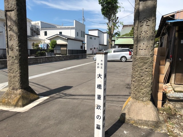 お寺の入口には、金堀山、空乗寺と書かれた2本の石柱と並んで、市指定史跡として大橋重正の墓と書かれた杭もたっています。大橋重正は、徳川家光などの右筆を務めたこともあり、書道の流派「大橋流」の始祖として知られています。
