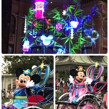 七夕飾りもかわいいし、ミッキーの形をした短冊もかわいいです。パレードでの織姫のミニーと彦星のミッキーもかわいいです。また、今年も短冊に願いを書けるといいなあ。ワールドバザールでのプロジェクションマッピングもすてきです。