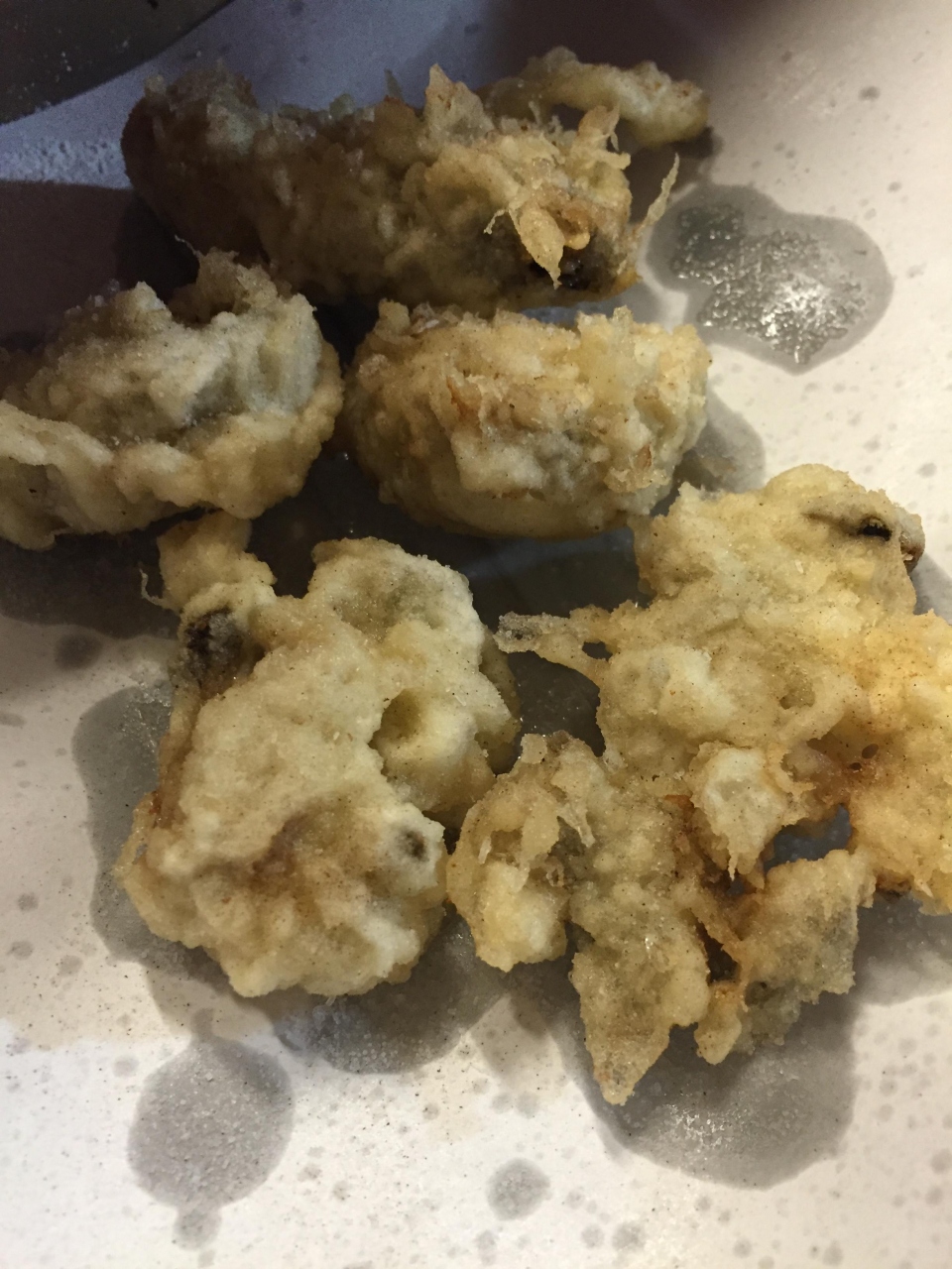 こちらは天ぷら屋さんということで、食べたことのないカキの天ぷらをいただきました。