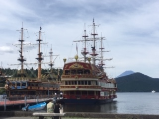 芦ノ湖の名物観光船です。外にでて、富士山や箱根の山々を見ることも良いのですが、観光シーズンには、船内でさまざまなイベントも開催されています。利用した日は海賊のコスチュームを着たマジシャンが手品をしてくれ、子供は大喜びで楽しんでいました。