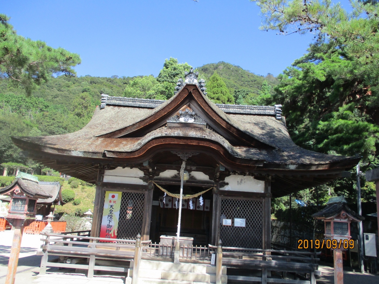 琵琶湖西岸国道161号線に面してたっています。近江最古の大社と言われ、瓊瓊杵尊(ににぎのみこと)が 降臨(こうりん)の際に道案内をした猿田彦命神を祀っています。古くから、開運、招福,導きの神として人々から信仰されているようです。本殿、拝殿のほか、裏の斜面にいくつかの社があり、この神社の長い歴史を感じることができます。また、鳥居は、道路を挟んだ琵琶湖内にあるのも特徴です。